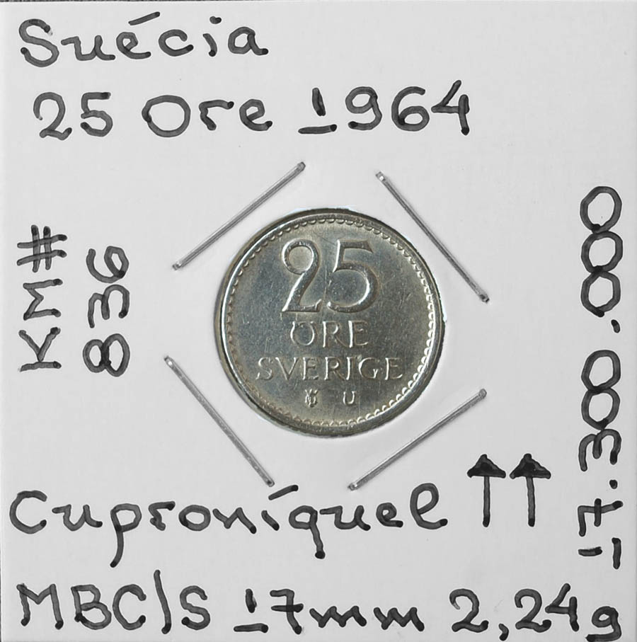 Suécia - 25 Ore 1964 - KM#836 - Cuproníquel - 17mm - 2,24gr - Cunhagem: 17.300.000 - S/FC - SWE8256w